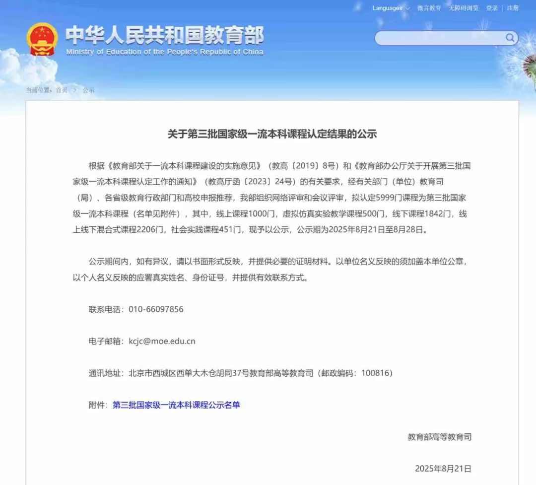 国家级一流本科课程是教育部“双万计划”的重要组成部分,旨在打造一批具有高阶性、创新性和挑战度的示范性课程。此次我校5门课程同时入选,体现了学校在专业特色和教学质量上的显著提升。